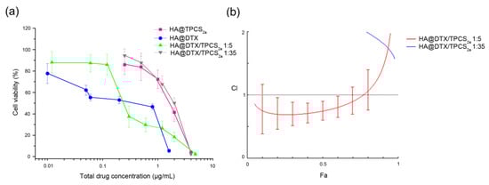 Cytotoxicity of single and combined treatments in differentiated MCF-7 cells cultured as monolayers. (a) Dose-response curves of cells incubated for 24 h with single drugs or their combination loaded in HA-NPs and irradiated with 1 J/cm2 of red light (600–800 nm) when PDT was part of the treatment. After additional 24 h in drug-free medium, cell viability was measured with the MTS assay. Total drug concentration is referred to DTX + TPCS2a concentration. Data are expressed as mean percentage ± SD of at least three independent experiments, carried out in triplicate. (b) Plots of combination index (CI) vs. fraction affected (Fa) relative to cells treated with HA@DTX/TPCS2a-NPs loaded with DTX and TPCS2a in the 1:35 (blue) or 1:5 (red) molar ratio.