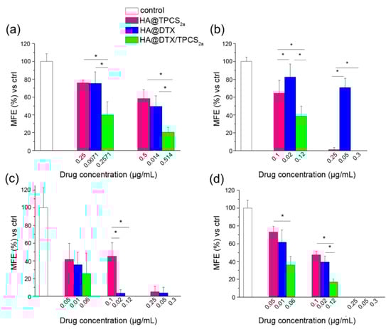Mammosphere formation efficiency (MFE) after HA-NPs treatments. Percentage MFE measured in first generation mammospheres generated from MDA-MB-231 (a) and MCF-7 (c) monolayered cells incubated for 24 h with HA@DTX-NPs, HA@TPCS2a-NPs and HA@DTX/TPCS2a-NPs, irradiated with 1 J/cm2, and re-seeded in non-adherent conditions to allow formation of spheres (protocol 1). Percentage MFE measured in second generation mammospheres generated from first generation mammospheres of MDA-MB-231 (b) and MCF-7 (d) exposed to drug-loaded NPs for 24 h, irradiated with 1 J/cm2, and re-seeded in non-adherent conditions (protocol 2). MFE was evaluated after 7 and 4 days from re-seeding for MCF-7 and MDA-MB-231, respectively. Data are expressed as mean ± S.D. of at least two independent experiments, carried out in triplicate; * p < 0.05 (one-way ANOVA, Bonferroni’s correction).