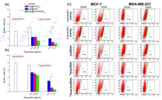 Quite different MFEs were measured when the treatments were applied to first generation mammospheres (Figure 3b,d), as exemplified also in the images of MDA-MB-231 and MCF-7 mammospheres treated with equivalent drug concentrations (Figure S5). Indeed, with both MDA-MB-231 (Figure 3b) and MCF-7 (Figure 3d) cells a significantly lower efficiency to form second generation mammospheres was measured using HA@DTX/TPCS2a-NPs with respect to single therapies. Moreover, while in MCF-7 we were able to completely abolish sphere formation even with single therapies, in MDA-MB-231 only treatment with HA@TPCS2a-NPs or HA@DTX/TPCS2a-NPs almost completely abolished the ability to form spheres. To confirm that the significant reduction of forming spheres capacity after treatments correlated with an effective reduction of the CSC populations within treated mammospheres, we measured also ALDH activity, a marker to identify BCSCs [27]. As shown in the summary graphs of Figure 4, BCSC population slightly increased from first to second generation in untreated MCF-7 mammospheres (4% and 4.9%) while it was the same in MDA-MB-231 cells (7.7% and 7.2%). In any case, BCSC population was significantly reduced after HA-NP treatments in both cell lines, even if a different extent of CSC reduction was measured. In MDA-MB-231 cells treated with the highest drug doses considered (e.g., 0.02 μg/mL DTX, 0.1 μg/mL TPCS2a), we were able to reduce CSCs by about 2.5, 7, and 14-folds using HA@DTX-NPs, HA@TPCS2a-NPs and HA@DTX/TPCS2a-NPs, respectively, with respect to untreated second generation mammospheres. Similarly, the same doses of drugs delivered in HA-NPs, determined CSC reduction in MCF-7 by about 2.5, 5, and 8-times. In agreement with the results on the MFE (Figure 3), the less effective treatment was DTX-chemotherapy alone, while its combination with PDT was the best option against BCSCs, since in both cell lines we were able to almost completely eradicate this small but relevant cell population.