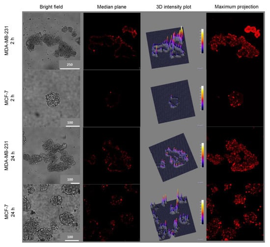 As confirmed also in the fluorescence intensity 3D plot reconstructions, the PS uptake was significantly increased in CD44-overexpressing mammospheres, even if mostly confined to the more external cell layers. Notably, when the incubation time was prolonged up to 24 h (Figure 5), TPCS2a uptake significantly increased also in MCF-7 mammospheres, very likely due to the prevailing of non-specific endocytosis, with respect to HA-mediated uptake of NPs, prolonging the time.