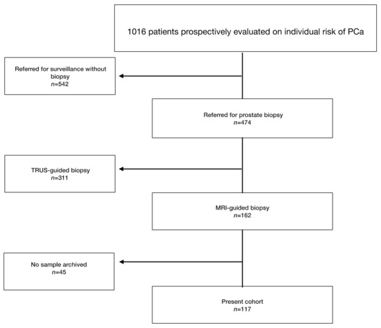 - Hendriks, R.J.; van der Leest, M.M.G.; Dijkstra, S.; Barentsz, J.O.; Van Criekinge, W.; Hulsbergen-van de Kaa, C.A.; Schalken, J.A.; Mulders, P.F.A.; van Oort, I.M. A urinary biomarker-based risk score correlates with multiparametric MRI for prostate cancer detection. Prostate 2017, 77, 1401–1407. [Google Scholar] [CrossRef] [PubMed]
