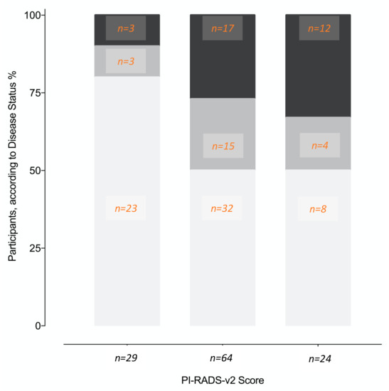Proportions of different disease status (%, number of patients) on image-guided biopsy according to the PI-RADS-v2 score lesions. No cancer (white), non-high-grade cancer (light grey), high-grade cancer (dark grey).
