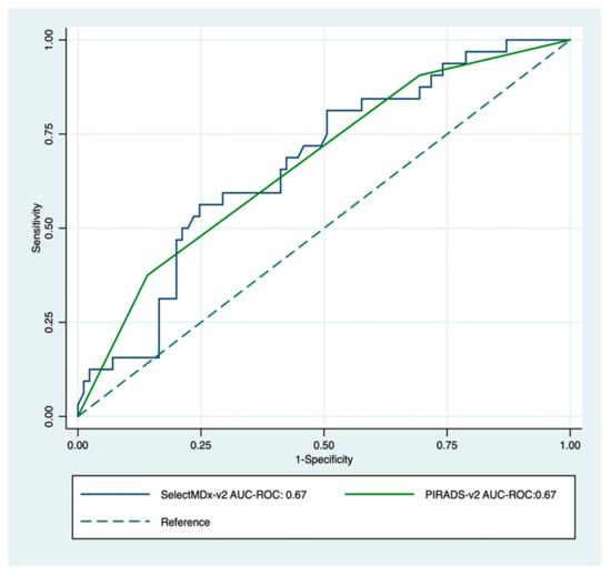 Receiver operating characteristic curve for PI-RADS-v2 score (green) and SelectMDx-v2; (blue) for the detection of high-grade cancer on image-guided biopsy. The dotted diagonal line is the reference line (AUC = 0.5).