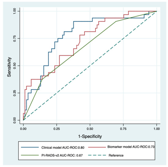 Receiver operating characteristics curve for PI-RADS-v2 score (green) and multivariable logistic regression of clinical model (PI-RADS-v2 score + PSA density + Age + DRE; blue) and biomarker model (PI-RADS-v2 score + SelectMDx-v2; red) for the detection of high-grade cancer on image-guided biopsy. The dotted diagonal line is the reference line (AUC = 0.5).