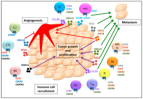 Multifaceted roles of chemokines and their receptors in immune cell recruitment, tumor growth and proliferation, angiogenesis, and metastasis. Chemokines guide the trafficking of different immune cells expressing their respective receptors into the tumor microenvironment, which induces both anti- and protumor immunity. Additionally, the chemokine system generally stimulates tumor growth and proliferation. Chemokines can also regulate angiogenesis with their angiogenic or angiostatic functions. Furthermore, chemokines are involved in tumor migration to secondary sites to develop metastasis. CTL, CD8+ cytotoxic T lymphocyte; Th1, T helper cell; NK, natural killer cell; Treg, regulatory T cell; B, B cell; iDC, immature dendritic cells; mDC, mature dendritic cell; N, neutrophil, M, macrophage; MDSC, myeloid-derived suppressor cell. The purple arrows show the promotion of tumor growth and proliferation. The red arrows indicate the angiogenic effect. The red T line indicates the angiostatic effect. The green arrows indicate the promotion of metastasis. (For detailed information, please see the text.).