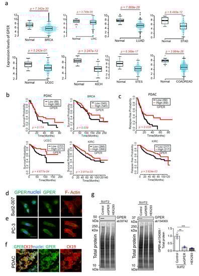 G protein-coupled oestrogen receptor (GPER) expression and correlation with survival in cancer (a) RNA-seq data from cancer types downloaded from TCGA cBioPortal (http://www.cbioportal.org/index.do), 11/2017 and 2/2018. Gene abundance quantified as RNA-seq by Expectation Maximisation). p values from Wilcoxon rank-sum test. BRCA—breast invasive carcinoma, LIHC—liver hepatocellular carcinoma, LUAD—lung adenocarcinoma, STAD—stomach adenocarcinoma, UCEC—uterine corpus endometrial carcinoma, KICH—kidney chromophobe, STES—stomach and esophageal carcinoma, and COADREAD—colorectal adenocarcinoma. Number of patients/normal—BRCA (1093/112), LIHC (371/50), LUAD (515/59), STAD (415/35), UCEC (545/35), KICH (66/25), STES (599/46), COADREAD (623/51). (b) Survival curves for cancer patients, divided into high and low expression determined using median gene expression of GPER. p values from Kaplan–Meier statistical test. PDAC—pancreatic ductal adenocarcinoma, and KIRC—Kidney renal clear cell carcinoma. For PDAC, BRCA, UCEC and KIRC, n = 177, 1090, 543, 532 patients respectively. (c) Relapse-free probability curves for PDAC and KIRC cancer patients. High and low expression determined using median gene expression of GPER. p value from Kaplan–Meier statistical test, For PDAC, KIRC n = 138, 434 patients. (d) Immunofluorescence images of GPER (green), actin (red), and DAPI (blue) in Suit2-007 cells. Scale bar = 25 µm. (e) Immunofluorescence images of GPER (green), actin (red), and DAPI (blue) in PC-3 cells. Scale bar = 25 µm. (f) Immunofluorescence images of GPER (green), cytokeratin 19 (red) and DAPI (blue) in PDAC patients. Scale bar = 100 µm. (g) Western blot for GPER and total protein in untreated SUIT2 cells (Control), SUIT2 cells with siRNA to GPER (siGPER) and HEK293 cells. Quantification of GPER (ab154069) normalised to total protein. Mean ± s.e.m. with individual values overlaid (n = 3); one-way ANOVA with Dunnett pairwise comparisons. ** p < 0.01, *** p < 0.001. Full blot images in Supplementary Figure S1.