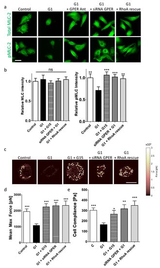We stained Suit2-007 cells for both total MLC-2 and phosphorylated MLC-2 (pMLC-2). While total levels of MLC-2 were unchanged when comparing all conditions, pMLC-2 levels were significantly decreased in the G1 condition (Figure 3a,b, Supplementary Figure S7c,d) compared to control, G1 + G15, siRNA GPER + G1, and G1 + RhoA rescue. PC-3 cells treated with G1 showed the same trend (Supplementary Figure S6a,b). The lack of difference in MLC-2 intensities indicates that the increase in pMLC-2 intensities only comes from phosphorylation events.