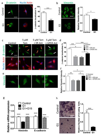 We observed that G1 treatment reduced β-catenin nuclear localisation and vimentin expression after 24 h (Figure 4a,b, Supplementary Figure S8a,b), indicating the loss of the mesenchymal phenotype. For the conditions G1 + G15, siRNA GPER + G1, vimentin levels were restored to levels similar to the control condition (Supplementary Figure S9). Additionally, both PCR analysis of Suit2-007 and PC-3 cells treated with G1 revealed decreased expression of vimentin and increased expression of E-cadherin at both the mRNA and protein level. Control levels of these proteins were restored with both G1 and G15 (Figure 4g, Supplementary Figure S8c).