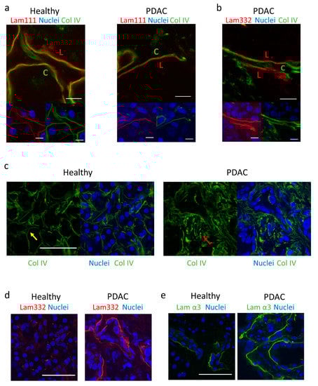 2.8. PDAC Epithelial Basement Membranes Show a Disorganised Collagen IV Arrangement and Altered Laminin Expression