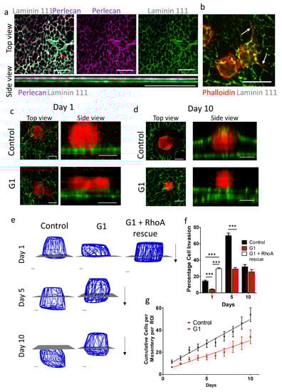 Mesenteries extracted from mice have been shown to be a suitable mimic for an in vivo basement membrane [54], which cells can invade through [23]. We have previously reported a protocol for the use of mouse mesenteries to assess pancreatic cancer cell invasion through the basement membrane [55]. We extracted mesenteries from mice and confirmed their integrity and composition by staining for laminin 111 and perlecan. We observed a continuous laminin 111 network, arranged as a bilayer (Figure 6a), in concurrence with previous analysis of these mesenteries [23].