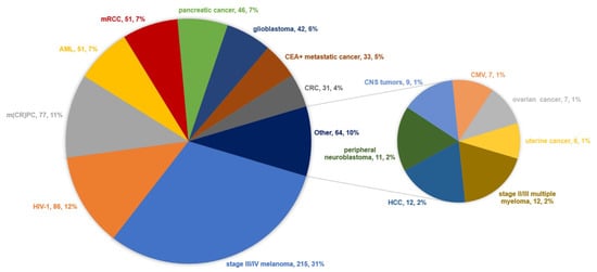 The vast majority of clinical trials examined RNA-modified DC vaccination in the context of cancer, collecting data on more than 600 vaccinated cancer patients (n = 602; 87%; Figure 1). Over a third of these patients suffered from stage III or IV melanoma (n = 215; 31%). Despite so many vaccinated cancer patients, an infectious disease is the second most frequently studied condition with over 80 vaccinated HIV-1 patients (n = 86; 12%). Together with metastatic prostate cancer (n = 77; 11%), acute myeloid leukemia (AML; n = 51; 7%), metastatic renal cell cancer (n = 51; 7%), pancreatic cancer (n = 46; 7%), glioblastoma multiforme (n = 42; 6%), CEA+ metastatic cancer (n = 33; 5%), and colorectal cancer (n = 31; 4%) these diseases make up 91% of all vaccinated patients. Other, smaller populations include stage II/III multiple myeloma (n = 12; 2%), hepatocellular carcinoma (n = 12; 2%), adrenal or retroperitoneal neuroblastoma (n = 11; 2%), other central nervous system tumors (n = 9; 1%), gynecological malignancies as ovarian (n = 7; 1%) or uterine cancer (n = 6; 1%), and finally CMV (n = 7; 1%) as the only other infectious disease besides HIV-1.