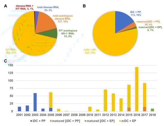 Distribution of all patients vaccinated in clinical trials with RNA-modified dendritic cells per (A) RNA source; (B) dendritic cell type and RNA loading strategy, including the number and percentage of total (n = 696), and (C) the spreading of the dendritic cell type and RNA loading strategy over time. Abbreviations: EP, electroporation; HIV-1, human immunodeficiency virus-1; iDC, immature dendritic cells; IVT, in vitro transcribed; mDC, mature dendritic cells; PP, passive pulsing; RNA, ribonucleic acid.