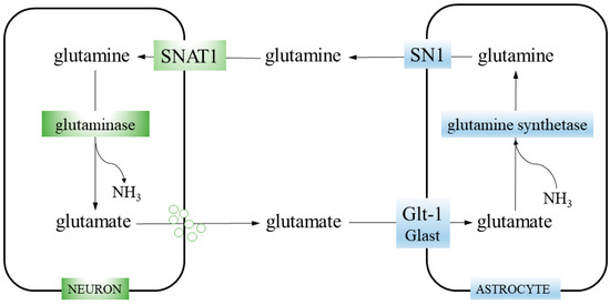 The healthy brain utilizes glutamine to synthetize glutamate, the prevailing activatory neurotransmitter. Since neurons are unable to synthesize either the neurotransmitter glutamate or γ-aminobutyric acid (GABA) from glucose, glutamate synthesis involves neuron–astrocyte cooperation termed the glutamine–glutamate cycle (Figure 1) [18].