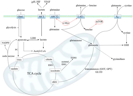 Metabolic pathways contributing to glutamine addiction in gliomas. Firstly, glutamine transport via Slc1a5 transporter (ASCT2) is increased in gliomas. The promoters of the Slc1a5 gene are under transcriptional control of oncogenic transcription factor c-MYC, which upregulates its expression. A substantial portion of intracellular glutamine is released from the cell via transporter LAT1 (Slc7a5; also upregulated by c-MYC) in exchange for extracellular leucine, an essential amino acid. The glutamine–leucine shuttle directly activates mTOR signaling, leading to increased protein synthesis. That way, an abundance of glutamine further accelerates the glioma anabolism. When in the cell, glutamine may be converted by glutaminase to glutamate, which is then metabolized to (i) alpha-ketoglutarate (αKG) (by transaminases GPT and GOT or glutamate dehydrogenase, GLUD) and serves for tricarboxylic acid (TCA) cycle anaplerosis; the reaction catalyzed by pyruvate carboxylase (PC), generating oxaloacetate (OAA) from pyruvate, is downregulated in most neoplasms; (ii) oncometabolite D-2-hydroxyglutate (D2HG) in the case of mutations in IDH1 enzyme, leading to a loss of proper enzymatic activity; iii) antioxidant glutathione (GSH), responsible for the treatment resistance; transporter XC- performs antiport of glutamate and cystine, which is a limiting substrate in GSH synthesis; and iv) lactate, which may be a source of energy when glutaminolysis takes place and the malate shuttle operates (malic enzyme synthetize lactate precursor, pyruvate, and NADPH) but also modulate tumor invasiveness via vascular endothelial growth factor (VEGF) and hypoxia-inducing factor (HIF); lactate was shown to stabilize HIF and then transactivate c-Myc in a pathway that mimics a response to hypoxia. In concordance to high lactate release observed in glioma, the lactate dehydrogenase (LDH), responsible for lactate synthesis, has been often reported to be upregulated. Last, but not least, glutamine availability is a limiting step for pyrimidine synthesis that highly proliferative cells, such as gliomas, need to be kept high.