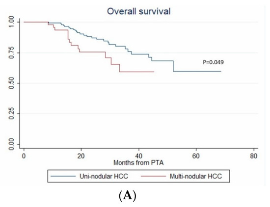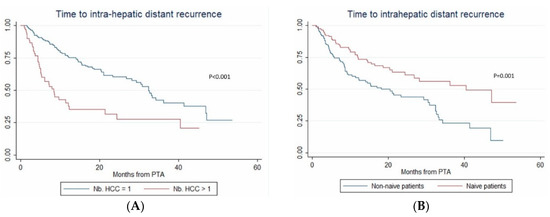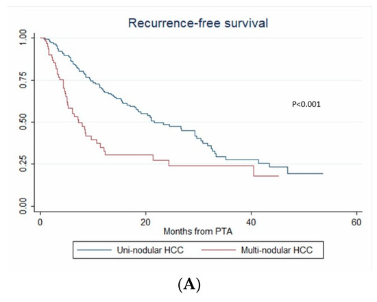 Not surprisingly, the serum AFP level was strongly and independently associated with both RFS and OS, as shown by other studies [4,7,33,34,35]. Conversely, limited data are available on the predictive value of the number of HCCs treated by PTA. To our knowledge, only one study compared time-to-IDR and OS in function of the number of nodules treated by PTA [4] and reported HR of 1.36 and 1.28 for time-to-IDR and OS, respectively, for multinodular (2–3) HCC compared to single tumor. This is in contrast with the strong multi-nodularity effect in our study (HR = 3.93 and 2.67 for time-to-IDR and OS, respectively). A different context (around 85% of viral infections, only 14.5% of high alcohol consumption) and more advanced HCC (29.7% of patients with >3 cm or >3 HCC nodules) [4] might explain the weaker effect of multi-nodularity in this previous study.