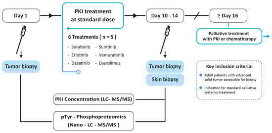 Study design. Patients with advanced solid tumors underwent tumor needle biopsy before and after 10–14 days of treatment with a protein kinase inhibitor, administered as standard treatment for their advanced disease or, off-label, prior to standard palliative chemotherapy. LC-MS/MS; liquid chromatography coupled to tandem mass spectrometry.