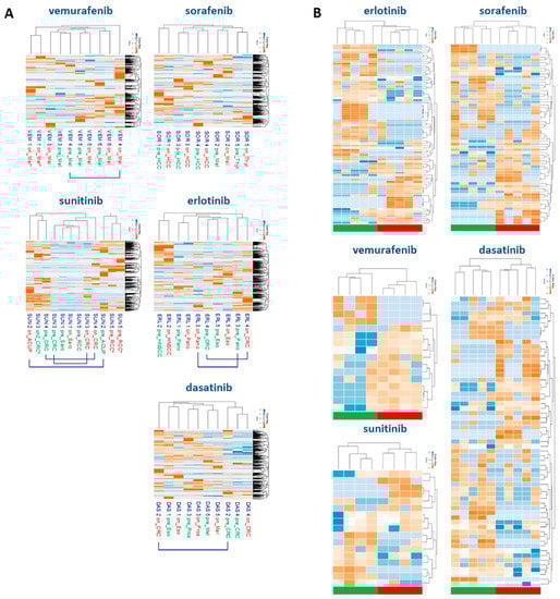 Hierarchical cluster analyses of pTyr-phosphoproteomics data. (A) Unsupervised hierarchical clustering of the pTyr-phosphoproteome in pre- and on-treatment tumor biopsies. Cluster analysis based on log10-transformed phosphopeptide intensities (red: high abundance, blue: low abundance) shows that samples from individual patients tend to cluster, except for the sunitinib cohort due to limited protein input. Pre- and on-treatment samples are labeled green and red, respectively. VEM1*, SUN5* denote workflow replicates. (B) Supervised hierarchical clustering of highly regulated phosphopeptides. Cluster analysis based on up- or downregulated phosphopeptides with a fold-change (intensity on-tx/pre-tx) of > 5 of observed phosphopeptide intensities, in at least 3 patients per cohort. Green blocks indicate pre-treatment samples, red blocks on-treatment samples. Separation of pre- and on-treatment groups is shown for all 5 PKI cohorts.