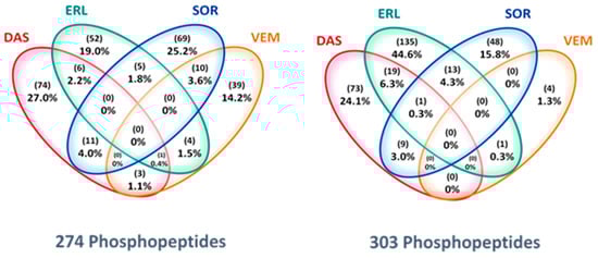 Analyzing the tyrosine phosphoproteome of all tumor biopsies, unsupervised clustering of the phosphopeptide intensities showed that within the drug cohorts, paired pre- and on-treatment tumor biopsies from individual patients clustered, indicating that PKI-induced changes to the phosphoproteome were smaller than inter-patient differences (Figure 2A). Despite the seemingly similar pre- and on-treatment profiles of individual patients, PKI treatment resulted in up- or downregulation of tens to hundreds of phosphopeptides per patient with a fold-change of on-treatment/pre-treatment intensity (Fc) of > 1.5–5 upon treatment (data not shown). The identification of phosphopeptides that were differentially regulated due to specific PKI treatment was shown by a stringent selection of (up- or down-) regulated phosphopeptides with a Fc of > 5 in at least 3 of 5 patients (≥60%) per cohort. Supervised clustering analysis of these highly regulated phopshopeptides separated pre- and on-treatment groups in all drug cohorts (Figure 2B; Table S5). Figure 3 shows the marginal overlap between the SOR, ERL, DAS and VEM treatment groups of Fc > 1.5 up- or downregulated phosphopeptides in ≥ 3 of 5 patients within each cohort, confirming that, even at a much less stringent selection, these 39–74 up- and 4–135 downregulated phosphopeptides were drug-specific. These data support preclinical evidence that at the concentrations we have measured (Table 2), these drugs do affect multiple kinases [,]. Analysis of Pearson’s correlations between reference samples measured along with the drug cohorts on subsequent days indicated that the differences in regulated peptides between the drug cohorts could not be attributed to day to day variation or batch effects (Figure S2).