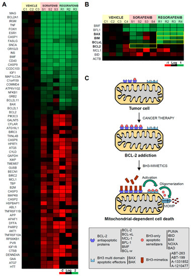 Sorafenib and regorafenib regulate the BCL-2 profile differently, sharing mitochondrial dependence but a distinctive therapeutic approach. (A) Transcriptomic analysis of genes related with liver cancer in BCLC9 tumors from nude mice treated for three weeks with vehicle (C1-3), sorafenib (S1-3), or regorafenib (R1-3). (B) mRNA expression of different BCL-2 proteins from treated tumors (C1-4, S1-4, and R1-4). Differences in the mRNA pattern are highlighted with yellow squares. (C) Cancer therapy may increase anti-apoptotic BCL-2 proteins avoiding cell death but mito-priming the cells to BH3-mimetics. Resistant hepatoma cells treated with compounds targeting BCL-2 proteins may release BH3-only proteins to bind BAX/BAK and trigger apoptotic cell death.