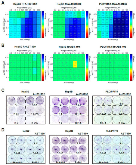 A-1331852 synergistically increased regorafenib cytotoxicity against different hepatoma cell lines. (A,B) MTT assays to test the A-1331852 and ABT-199 effect on regorafenib cytotoxicity in different liver cell lines (HepG2, Hep3B, and PLC/PRF/5) were performed, synergy calculated using HSA analysis, and results displayed with heat maps (blue synergy vs. red antagonism). (C,D), Crystal Violet staining was performed after 3 days of treatment with vehicle (C), regorafenib (R), and/or A-1331852/ABT-199 (A) in HepG2, Hep3B, and PLC/PRF/5 cell cultures. (n = 3) * p < 0.05 vs. control.