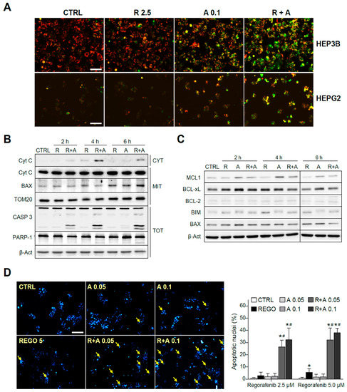 The regorafenib and A-1331852 combination induced apoptotic cell death via a mitochondrial caspase-dependent mechanism. (A) Hep3B and HepG2 cells were exposed to regorafenib (R, 2.5 μM) with or without A-1331852 (A, 0.1 µM) and MMP loss observed by fluorescence microscopy after 3 h (scale bar, 100 µm). (B) Cytochrome c release, BAX and TOM20 mitochondrial levels, caspase-3, PARP-1, and β-Actin were analyzed by Western blot in HepG2 cells. (C) BCL-2 proteins in cell extracts as above. (D) Nuclear Hoechst 33258 staining was visualized in HepG2 cells treated with regorafenib and/or A-1331852 (scale bar, 100 µm), and apoptotic cells counted (10 independent fields per condition, n = 3). * p < 0.05 vs. control cells, # p < 0.05 vs. regorafenib-treated cells.