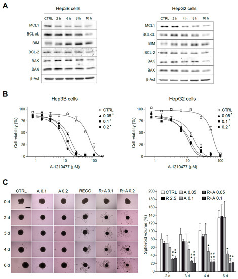 MCL-1 inhibition sensitizes hepatoma cells to the BCL-xL inhibitor A-1331852. (A) Representative Western blot images of MCL-1, BCL-xL, BIM, BCL-2, BAX, BAK, and β-Actin exhibited by Hep3B and HepG2 cells at different times (0–16 h) after regorafenib treatment (5 µM). (B) Effect of the MCL-1 inhibitor A-1210477 on Hep3B cells and HepG2 cells treated with A-1331852 (A, 0.05, 0.1, or 0.2 µM) for 24 h. * p < 0.05 vs. control cells. (C) Hep3B spheroids were seeded and after 24 h of aggregation treated with vehicle, regorafenib (R, 2.5 μM), and/or A-1331852 (A, 0.1 or 0.2 µM) for seven days. Spheroid growth was monitored daily (scale bar, 500 µm). (n = 3) * p < 0.05 vs. control cells, # p < 0.05 vs. regorafenib-treated cells.