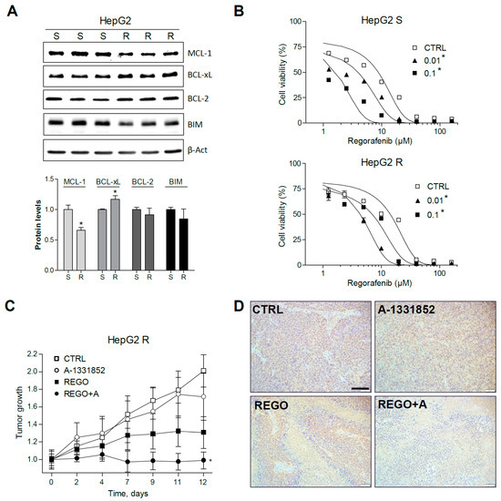 Regorafenib-resistant HepG2 cells, exhibiting mRNA changes in BCL-xL and MCL-1, are re-sensitized to regorafenib by A-1331582. (A) Representative Western blot images of MCL-1, BCL-xL, BCL-2, BIM, and β-Actin protein levels in S and R HepG2 cells. * p < 0.05 vs. sensitive cells. (B) Effect of A-1331852 (A, 0.01 or 0.1 µM) on S and R HepG2 cells. * p < 0.05 vs. control cells. (C) Subcutaneous growth of R HepG2 cells in mice treated orally with A-1331852 (25 mg/kg) and regorafenib (30 mg/kg) for 2 weeks (n = 4). (D) Representative images of PCNA expression in tumors from HepG2 R CDXs (scale bar, 100 µm). * p < 0.05 vs. vehicle-treated mice.