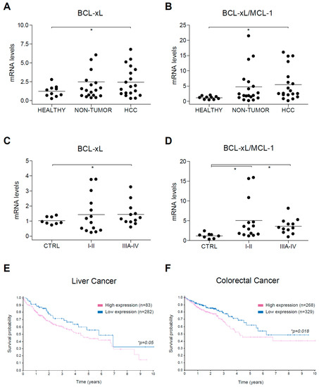 Alterations in BCL-xL mRNA levels and BCL-xL/MCL-1 ratio in HCC patients. (A) BCL-xL and (B) BCL-xL/MCL-1 mRNA levels were measured by qPCR in healthy liver (n = 10) and in cirrhotic and tumoral tissue from HCC patients (n = 12) with Hepatitis C virus (HCV) and/or Ethanol (EtOH etiology. * p < 0.05 vs. control. (C) BCL-xL and (D) BCL-xL/MCL-1 mRNA levels were measured by qPCR in a commercial mRNA array with healthy liver (n = 8) and tumoral tissue from HCC patients in different stages (I-II, n = 14; IIIA-IV, n = 12). (E,F) Representation of survival probability depending on BCL-xL expression (blue, high; purple, low) in patients with liver and colorectal cancer, respectively.