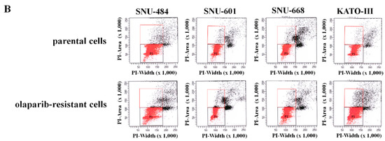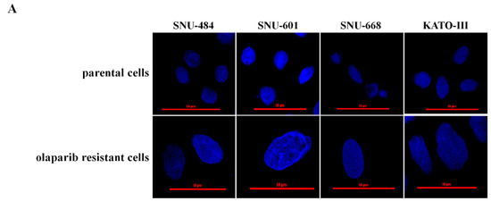 With the acquisition of resistance to olaparib, the nuclear size of the resistant cells increased, as assessed by confocal imaging (Figure 3A). Increased abnormal DNA contents indicating aneuploidy was not observed in cells with increased nuclear size (Figure 3B). In the olaparib-resistant cells, increased nuclear size indicated the relaxation of DNA condensation [16,17].