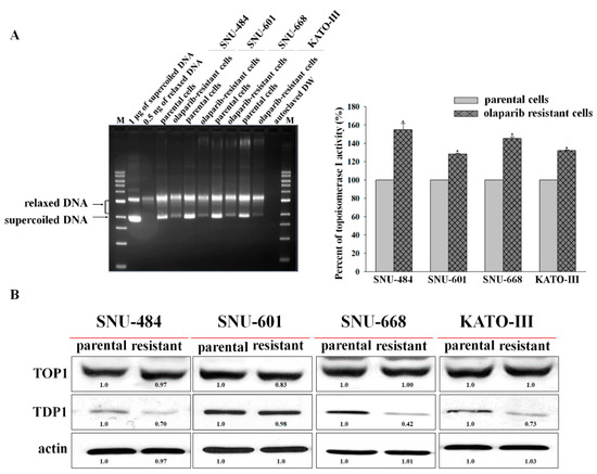 Topoisomerase 1 (TOP1) activity was increased and tyrosyl-DNA phosphodiesterase 1 (TDP1) expression was downregulated in olaparib-resistant cells. TOP1 activity was increased in all olaparib-resistant cells compared with parental cells (A), although the protein expression of TOP1 was not altered (B). TDP1 protein expression was downregulated in olaparib-resistant SNU-484, SNU-668, and KATO-III cells compared with their parental cells (B). * indicates p < 0.001.