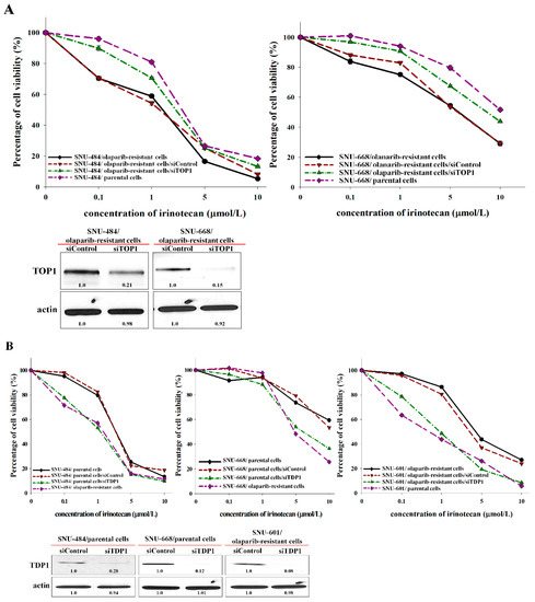 PARP-1 is activated by irinotecan-induced DNA breaks. PARP inhibitors share their predictive characters with platinum and enhance the cytotoxicity of topoisomerase 1 (TOP1) inhibitors [12]. Restoration of homologous recombination through a loss of 53BP1 or BRCA re-expression is an important mechanism for PARP inhibitor resistance in BRCA1-deficient mammary tumors [13]. A previous study has demonstrated that ATM regulates TOP2 expression. ATM loss results in increased TOP2 levels and enhances sensitivity to TOP2 inhibition [14]. Therefore, it could be possible to compensate for an impaired DNA repair pathway from olaparib by another repair-pathway related to SSB, including the TOP1 and tyrosyl-DNA phosphodiesterase 1 (TDP1) pathways, in resistant cell lines that have been exposed to olaparib for long periods. On the other hand, it was reported that TDP1 and TOP1 are predictive biomarkers for irinotecan and new therapeutic targets in the era of precision medicine [14,15].