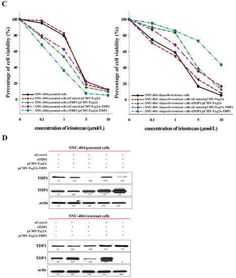 pME18S-FL3-TOP1 and pOTB-TDP1 plasmids were purchased from the Korean human gene bank (Daejoen, Korea) and both TOP1 and TDP1 were subcloned into pCMV-Tag2A vector. SNU-484 and SNU-668 parental cells were transfected with 4 µg of pCMV-Tag2A-TOP1 plasmid and/or 160 nM of TDP1-specific siRNA, while SNU-484 and SNU-668 olaparib resistant cells were transfected with 4µg of pCMV-Tag2A-TDP1 plasmid and/or 160 nM of TOP1-specific siRNA using Lipofectamin 2000 (Invitrogen, Carlsbad, CA, USA). TOP1- and TDP1-specific siRNAs were synthesized from Genolution (Seoul, Korea), and the sequences of the TOP1-specific siRNAs were 5′-GGGAAGGACTCCATCAGATACTATA-3′, 5′-AAGTGGAAATGGTGGGAAGAA-3′, and 5′-CGAAGAAGGTAGTAGAGTC-3′, and the sequences of the TDP-specific siRNAs were 5′-GACCATATCTAGTAGTGAT-3′, 5′-GGAGTTAAGCCAAAGTATA-3′, and 5′-CTAGACAGTTTCAAAGTG-3′. The sequence of the non-specific siRNA was 5′-AATTCTCCGAACGTGTCACG-3′.