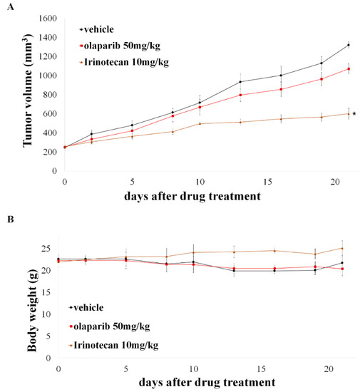Irinotecan impeded tumor growth in a BRCA2 mutant PDX model with acquisition of olaparib resistance. (A) PDX model were treated with 50 mg/kg olaparib or 10 mg/kg irinotecan for 21 days (n = 4/group). The mean of tumor volumes was presented in a graph with the standard deviation (SD). * indicates p < 0.001 versus vehicle and olaparib group. (B) Changes in body weight were measured every three days for 21 days.