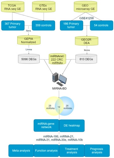 Study pipeline. In this study, a variety of public datasets were utilized to predict novel candidate miRNA biomarkers for colorectal cancer (CRC) early diagnosis via systemic bioinformatics analysis. RNA-seq and microarray gene expression (GE) data concerning CRC patients and normal controls were downloaded from the public databases to make differential expression (DE) analyses (DEA), respectively. The differential expressed genes (DEGs) together with CRC related miRNAs were then input in our MiRNA-BD, a software to predict new biomarkers based on the miRNA-mRNA interaction network. There are 12 promising biomarkers that were predicted by the both RNA-seq and microarray data. Two (miRNA-21-5p and miRNA-31-5p) of them were previously reported as CRC diagnostic miRNA biomarkers. The expression level and miRNA-gene interaction network further identified the novel candidate miRNAs. miRNA-10b-5p, miRNA-30e-5p and miRNA-186-5p were finally found as the novel potential miRNA biomarkers for CRC early diagnosis. These findings were further confirmed by meta-analysis and biological function analysis. Associations of the novel candidate miRNA biomarkers with patients treatment and prognosis were also evaluated.
