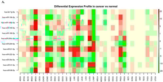The meta-profiling heatmap of the DE miRNA in different cancers was drawn to observe the expression levels of miRNA promising biomarkers and further select the final candidate biomarkers.