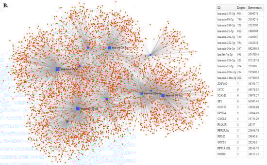 The interaction networks for identified and candidate miRNA biomarkers with genes, LncRNAs, small molecules, and diseases were drawn to verify the predication results and further detect the relationships between miRNA biomarkers and other biological components. In our biological networks, each node represented the corresponding biological component like gene, miRNA, LncRNA, small molecule, as well as various diseases. The connecting edges among different nodes reflected that they had relationships with each other. We used two network topology features (Degree and Betweenness centrality) on the miRNA-gene network to cluster the candidate biomarkers and make a further selection. The degrees in network were the number of edges that connect the target node. The shortest path is the path with minimized edges between two nodes. The betweenness centrality is the number of shortest paths that pass through the target node.