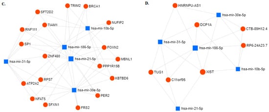 The miRNA-gene interaction network was visualized in Figure 2B, showing that miRNA-186-5p shared similar network topology features with miRNA-21-5p, miRNA-30e-5p, miRNA-10b-5p and miRNA-31-5p were clustered into same level in the miRNA-gene network (similar degree and betweenness).
