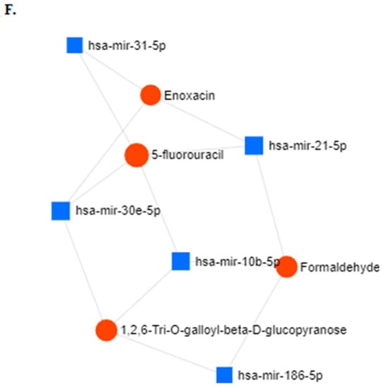 In Figure 2F, we found that the four of these miRNAs (miRNA-21-5p, miRNA-30e-5p, miRNA-10b-5p and miRNA-31-5p) having relationships with 5-FU, a fundamental chemotherapeutic medicine for CRC. Table 2 shows these miRNAs and their associated target genes that affect 5-FU therapy resistance.
