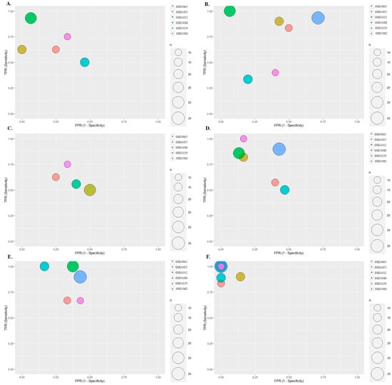 Meta-analyses results for the predicted miRNA biomarkers. Each circle represents specific GSE datasets included in the meta-analysis, and indicates the sensitivity (y-axis) and 1-specificity (x-axis). The closer to the left corner indicating both sensitivity and specificity close to 1 and the better accuracy of the biomarker for CRC diagnosis). Different sizes and colors of the circles reflect the number of CRC patients for the relevant dataset. (A). miRNA-186-5p: miRNA-186-5p played the best role for the diagnosis of patients in GSE41012 and worst in GSE54088; (B). miRNA-30e-5p: miRNA-30e-5p showed the highest diagnosis value in the diagnosis of GSE41012 CRC patients; (C). miRNA-10b-5p: the patients from GSE35982 and GSE39845 were diagnosed more accurately than the patients in other datasets; (D). miRNA-21-5p: miRNA-21-5p performed a diagnostic value in the CRC patients in GSE35982, GSE41012 and GSE41655; (E). miRNA-31-5p: miRNA-31-5p as an ideal diagnosis biomarker in the CRC patients from GSE54088; (F). Multiple biomarkers showed the best diagnosis value in the CRC patients from all the datasets.