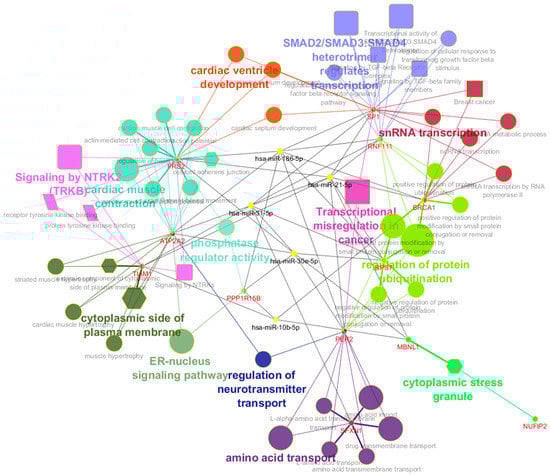 4.4. miRNA DE Heatmap, Biological Interaction Networks and Function Analyses