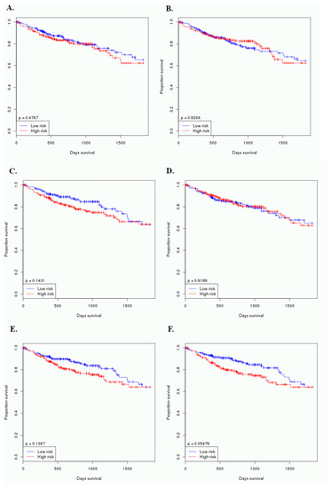 In this study, 424 CRC patients were involved in the prognosis test for miRNA candidate biomarkers. The sample sets were arranged as two equal parts according to their survival time, and high/low risks were represented as long-survival/short-survival patients groups. The p values were from log-rank tests. Figure 6 showed the CRC patient survival based on the analyses of the miRNAs and their multiple biomarkers, and there were no statistical differences tween the five predicted miRNAs and CRC prognosis (p values > 0.05).