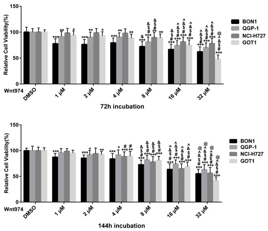 Effect of WNT974 on the reduction of neuroendocrine tumor (NET) cell viability in a dose- and time-dependent manner. The cell viability of human pancreatic BON1 and QGP-1, bronchial NCI-H727, and midgut GOT1 NET cell lines was assessed after treatment with WNT974 compared with that of dimethyl sulfoxide (DMSO) control. The data are expressed as mean ± SD. Each experiment, with technical triplicates, was repeated at least thrice. * p < 0.05, ** p < 0.01, and *** p < 0.001 compared with that of DMSO controls. # p < 0.05 (2 μM–32 μM vs. 1 μM, respectively), $ p < 0.05 (4 μM–32 μM vs. 2 μM respectively), & p < 0.05 (8 μM–32 μM vs. 4 μM respectively), ^ p < 0.05 (16 μM–32 μM vs. 8 μM respectively), @ p < 0.05 (16 μM vs. 32 μM).