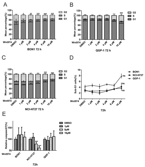 No induction of apoptosis was observed following incubation of BON1, QGP-1, and NCI-H727 cells with WNT974 at concentrations of 1–16 µM (Figure 2). Following WNT974 treatment, the FACS analysis showed no significant increase in sub-G1 phase accumulation (Figure 2D) and the caspase 3/7 assay showed no significant increase in caspase 3/7 activities (Figure 2E). Surprisingly, WNT974 even suppressed caspase 3/7 activity in NCI-H727 (p < 0.001).