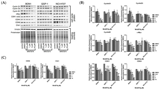 We next used FACS and Western blot to assess the effect of WNT974 treatment on the regulation of cell cycle distribution and apoptosis in order to better understand the WNT974-induced reduction of NET cell viability (Figure 2 and Figure 3). Treatment of NET cells with WNT974 at concentrations of 1–16 µM for 72 h resulted in the dose-dependent arrest of BON1 and NCI-H727 cells at the G1 phase of the cell cycle (Figure 2A,C). Following incubation with WNT974 (16 µM), 75.4% (vs. 61.4% of the control) and 74.0% (vs. 57.6% of the control) of the cells were observed to be in G1 phase for the BON1 and NCI-H727 cell lines, respectively. Meanwhile, the percentage of S phase cells decreased to 8.0% (vs. 14.1% of the control) and 7.4% (vs. 12.8% of the control), in BON1 and NCI-H727 cell lines, respectively. In QGP-1 cells, incubation with WNT974 (16 µM) induced the accumulation of cells in the G2 phase 25.13% (vs. 15.24% of the control cells) and subsequently decreased the percentage of cells in the G0/G1 phase to 68.07% (vs. 77.93% of the control cells) (Figure 2B). Thus, WNT974 caused cell cycle arrest in BON1, QGP-1, and NCI-H727 cells (Figure 2A–C). Accordingly, Western blot data demonstrated that treatment with WNT974 caused dose-dependent downregulation of the expression of cyclin D1, cyclin D3, and cyclin B1, as well as cyclin-dependent kinases (CDK1, CDK4, and CDK6) and checkpoint kinase-1 (CHK1) (Figure 3).