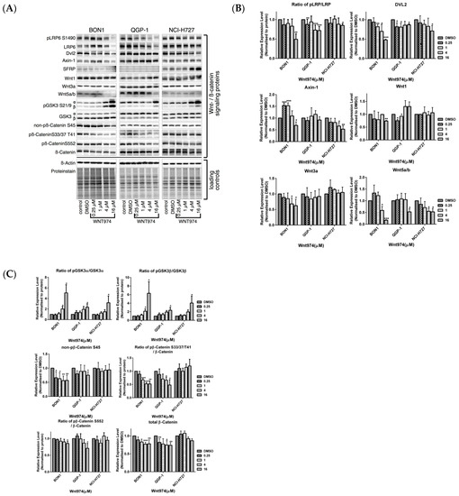 Treatment of BON1 and QGP-1 cells with WNT974 at concentrations of 0.25–16 µM significantly downregulated the expression of LRP/pLRP6, DVL2, and Wnt5a/b and reduced the level of non-phosphorylated β-catenin, total β-catenin, and β-catenin phosphorylation at Ser33/Ser37/Thr41 (Figure 4) and its downstream targeting proteins, such as c-Myc, cyclinD1, and cyclinD3 (Figure 3). These effects of WNT974 were more prominent in BON1 and QGP-1 cells but slightly weaker effects were also observed for NCI-H727 cells. However, secreted frizzled-related protein 1 (SFRP1), an antagonist of Wnt signaling, was increased by WNT974 treatment only in NCI-H727 cells (Figure 4), suggesting cell-line-specific modulation of the Wnt signaling cascade.