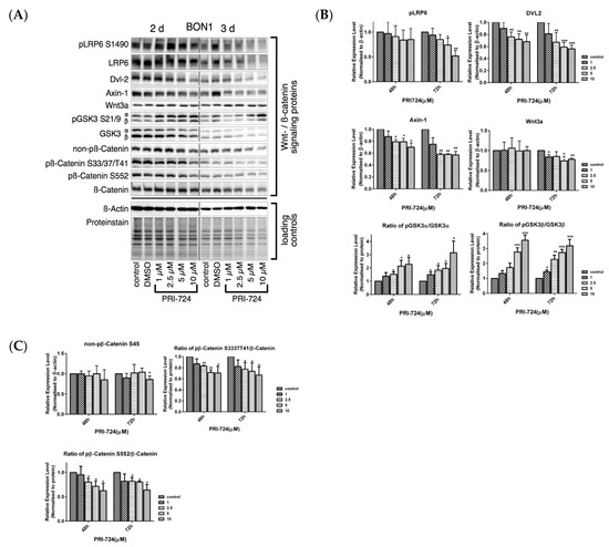 Effect of PRI-724 on protein expression levels of Wnt/β-catenin signaling proteins. BON1 cells were treated with PRI-724 for 48 h and 72 h and then subjected to Western blot analysis. (A) A representative Western blot is shown. Equal protein loading was verified in all Western blots by normalization to the total protein staining and by the housekeeping protein β-actin. (B,C) Densitometric quantification of Western blot data was performed. The DMSO control was set as 1.0. Relative expression levels (normalized to DMSO control) of treated cells were calculated in %. * p < 0.05, ** p < 0.01, and *** p < 0.001 compared with that of DMSO controls.