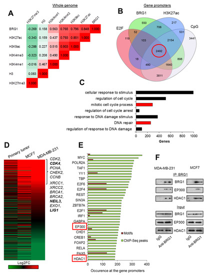 BRG1 occurs at the acetylated promoters of some highly transcribed genes, which control proliferation and DNA repair in breast cancer cells. (A) BRG1 co-distribution with histone H3 density and histone modifications in the genome of MDA-MB-231 is shown as Pearson’s correlation coefficient. (B) Occurrence of BRG1 at the acetylated gene promoters characterized by E2F binding site and CpG island has been quantified on a Venn diagram and BRG1/H3K27ac/E2F/CpG promoters are marked in red circle. Green and blue circles represent gene promoters enriched in BRG1 and H3K27ac peaks according to MACS, while grey and red represent promoters featured by the presence of CpG islands according to cpgIslandExt and E2F binding motifs according to cpgIslandExt and wgEncodeRegTfbsClusteredV3, respectively. (C) Functional association of BRG1/H3K27ac/E2F/CpG gene promoters (marked in red circle in (B) leads to enrichment of intracellular processes that can define cancer physiology. Red bars represent biological processes, which are taken for further analysis in (D) and (E). (D) Analysis of differential gene expression from data derived from RNA-Seq confirms overexpression of genes functionally assigned to the mitotic cell cycle and to responses to stimuli of DNA damage in cancer cell lines versus normal breast cells. Genes marked in bold were taken as examples for further analysis in Figure 2A–D. (E) BRG1/H3K27ac/E2F/CpG promoters of genes overexpressed in cancer cells (D): Log2FC > 0.5 for at least 2 of the cell types used are characterized by common transcription factors and chromatin remodelers. Green columns correspond to the number of ChIP-Seq peak occurrences at the gene promoters according to UCSC wgEncodeRegTfbsClusteredV3, whereas red columns represent the occurrence of transcription factor binding motifs according to tfbsConsSites. Only every other transcription factor is labeled. (F) Immunoprecipitation of BRG1 allows to detect EP300 and HDAC1 by western blot and indicates the physical interaction between SWI/SNF component and the latter two enzymes. Pictures show cropped areas of western blots. Whole images are included in Figure S3.