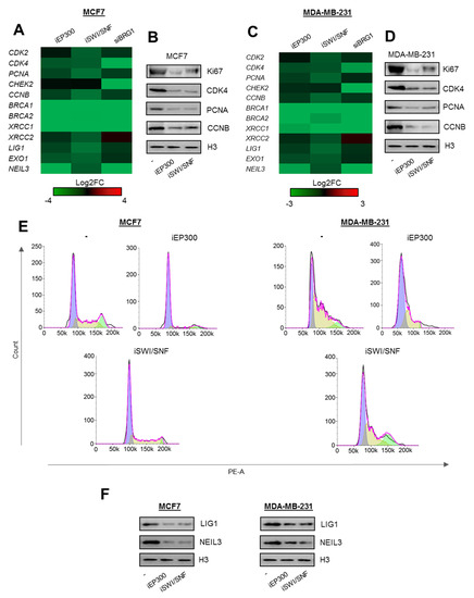 Repression of proliferation-relevant genes by the deficiency of BRG1 and EP300 activity led to a substantial reduction in protein proliferation markers (also others than BRG1 targets—Ki67) and to cell cycle arrest in G1 (Figure 2B,D,E). Similarly, DNA repair gene repression was followed by loss of LIG1 and NEIL3 protein upon EP300 and SWI/SNF inhibition (Figure 2F).
