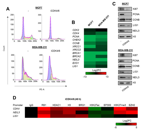 DNA repair genes are transcriptionally controlled by the cell cycle progression. (A) Deficiency of CDK4/6 activity results in complete cell cycle blockade in G1. (B,C) Inhibition of CDK4/6 for 48 h leads to repression of genes that drive cell cycle progression and genome resistance to damage. mRNA ((B) shows Log2FC versus untreated) and protein (C) was monitored by real-time PCR and western blot in breast cancer cells exposed to iCDK4/6 for 48 h. Pictures in (C) show cropped areas of western blots. Whole images are included in Figure S3. (D) G1 arrest induces considerable chromatin remodeling and adjustment of protein composition to gene repressive conditions at the promoters of CDK4, NEIL3, and LIG1 (ChIP/real-time PCR) 48 h after administration of iCDK4/6 in culture of MCF7 cells. Analysis of the cell cycle progression (A) was monitored twice in two technical replicates for each condition, quantification of gene expression in response to iCDK4/6 (B) and ChIP/real-time PCR analysis of CDK4, NEIL3 and LIG1 promoters (D) were carried out 4 times, while western blots were repeated 3 times and representative images are shown in (C). Detailed statistical data can be found in Table S3.