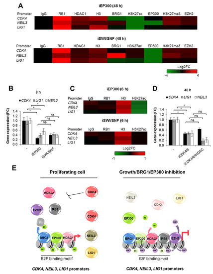 To study in detail the molecular mechanism of BRG1 contribution to regulation of transcription and possible functional interdependence with the cell cycle progression, we focused on three promoters of genes, which are crucial for cell proliferation—CDK4 and effective removal of DNA lesions—LIG1 and NEIL3. As shown in Figure 1B and Figure 2A–F), all three genes are transcriptionally controlled by BRG1 and EP300. Their promoters are featured by the presence of BRG1, EP300, CpG island, and E2F motif. Especially, due to the last feature, they are likely to respond to alterations in cell proliferation status and to assemble RB1-based repressive complexes. Therefore, these promoters were chosen to study the considered cross-talk between BRG1 activity, chromatin remodeling, and cell cycle status. Furthermore, CDK4 deficiency caused by BRG1-dependent gene repression, that in cell cultures results in cell growth arrest, can be easily phenocopied by the use of CDK4/6 inhibitors, which equally arrest cells in G1. Thus, from this point the following hypotheses were tested: (a) BRG1/H3K27ac/CpG/E2F promoters of proliferation and DNA repair genes respond to G1 arrest with decreased gene transcription and formation of RB1-based repressive complexes; (b) long-term inhibition of BRG1-EP300 complexes that results in G1 arrest also leads to RB1-based chromatin remodeling at the studied, cell cycle-dependent promoters.
